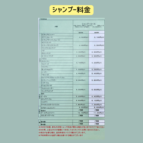 ※大きさや体重、被毛の状態によっては料金が異なる場合がありますのでご了承ください。